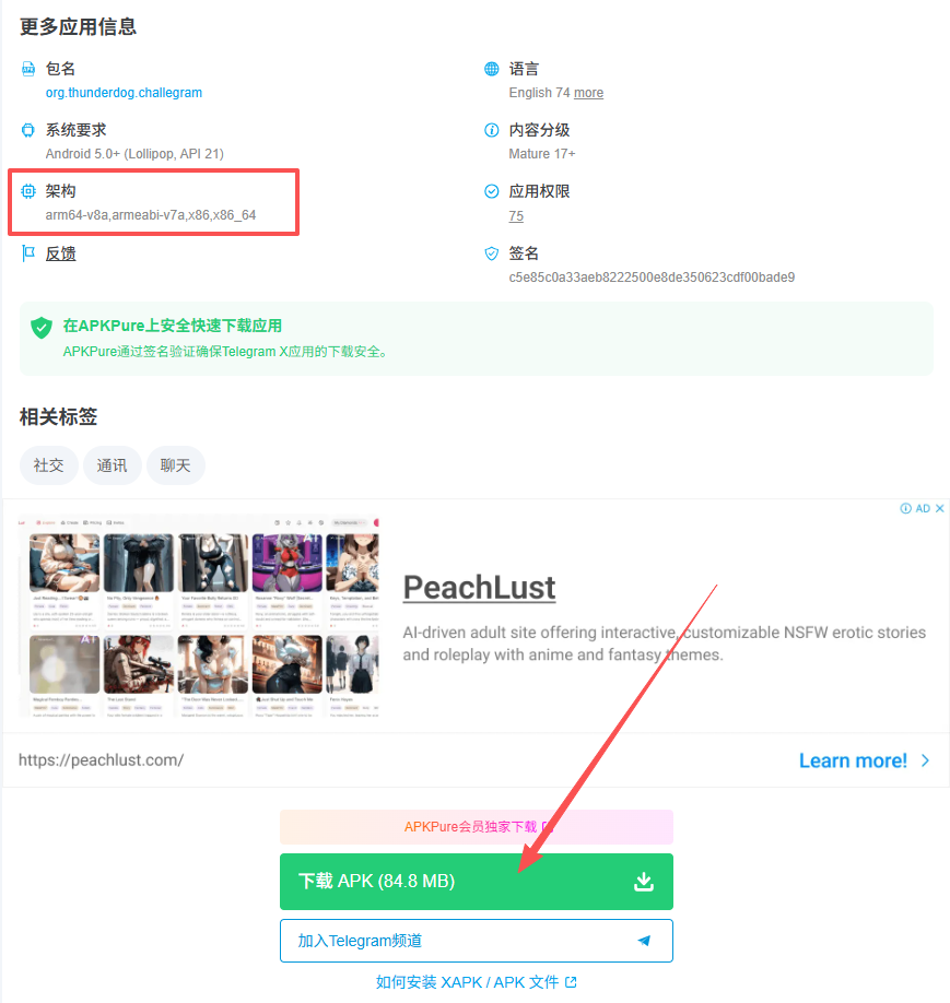 telegram x 为什么谷歌商店才 30M 。而在网上下载却要 80M 。是因为网上下载的包含的 armv7 和 armv8a 这两种格式。也就是旧手机系统仍然是 32 位的依然可以使用 telegramx 。但是谷歌商店会根据你的手机系统给你安装 v8a 的 64 位的 app 。所以只有 30M 。而网上的 app 都是包含 32 位和 64 位的。所以是 80M 。apkpure 一般是由网友自己上传的。并不一定是从谷歌商店同步的。所以很多病毒 app 。现在想下载旧版 app 很难。很容易在网上下载到病毒 app 。所以只能在谷歌商店追新。如果不能使用谷歌商店。请下载 aurora store 。这个不需要登陆谷歌商店也可以下载。请提前打开富强,然后再使用 aurora store 。